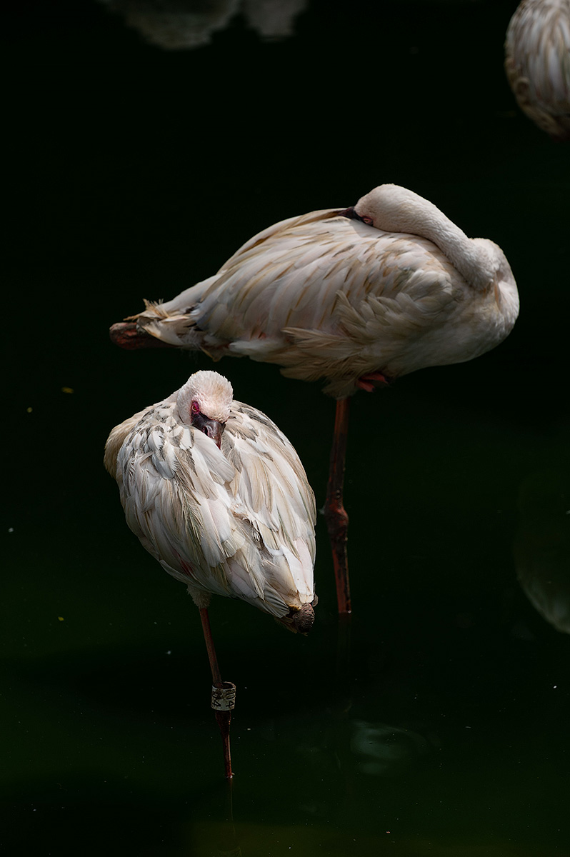 ไปต่อที่อีกบ่อฟลามิงโก้ อันนี้เป็นพันธุ์ฟลามิงโก้เล็ก (Lesser Flamingo) ที่ตัวเล็กกว่าและสีชมพูมากกว่าส้ม บางตัวกำลังหาปลากินกันอยู่เลย เอาปากจุ่มน้ำแล้วซักพักก็งับปลาขึ้นมา บางตัวก็ยืนเอาหัวซุกใต้ปีกหลับกันอยู่เหมือนก้อนๆขาวๆปักบนแท่งไม้